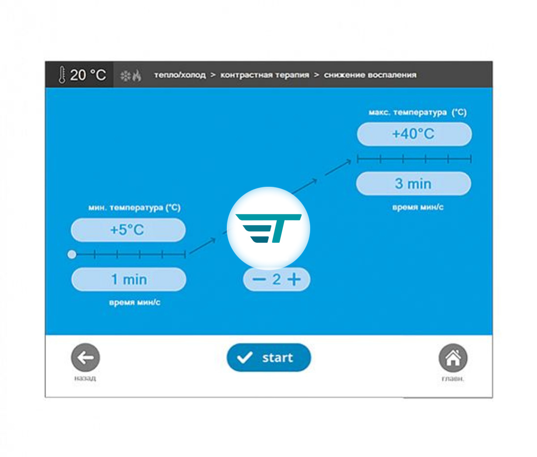 При активации данной функции аппарат автоматически понизит температуру на 30°C за 45 секунд. Данный метод используется для криотерапии суставов при остеоартрите, при боли в мышцах, травмах, а также для восстановления в пост-операционный период.